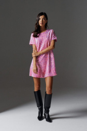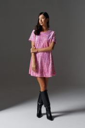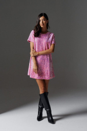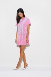 Платье полуприлегающего силуэта выполнено из розовой ткани с пайетками. Характеристики: полуприлегающий силуэт, подкладка, горловина овальная, рукав втачной короткий, застежка петля пуговичка по спинке изделия. Длина по спинке 80 см, длина рукава 20 см.