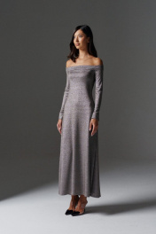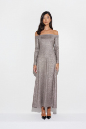Платье с полуоткрытыми плечами полуприлегающего силуэта выполнено из ткани с люрексовой нитью. Характеристики: полуприлегающий силуэт, полуоткрытые плечи, подгиб по горловине переходящий на спинку, рукав длинный. Длина по спинке 123 см, длина рукава 62 см.