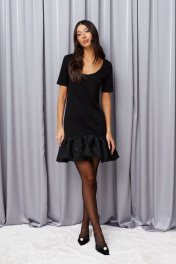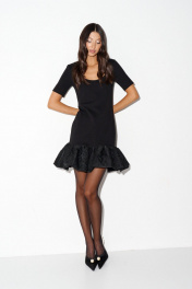 Платье полуприлагающего силуэта. Выполнено из трикотажного полотна чёрного цвета. Горловина круглая, глубокая. Рукав втачной. По низу платье декорировано объёмной рюшей с изгибом из органзы. Зстёжки в изделии нет. Длина рукава 25 см. Длина спинки 86 см