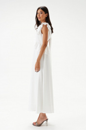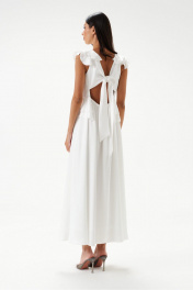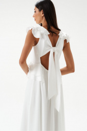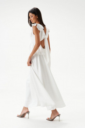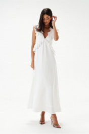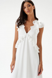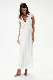 Платье полуприлегающего силуэта. Выполнено из мягкого струящегося полотна белого цвета. Вырез горловины V-образный. Лиф выполнен из двойной ткани. Выше линии талии (под грудью) фигурный отрез, декорирован рюшами, переходящими на спинку. По спинке отрез на резинке. По спинке декоративный вырез, над вырезом завязки. Плечо и горловина декорированы рюшами. Юбка в платье свободного кроя, с подкладкой. Длина платья от проймы 113 см.