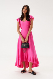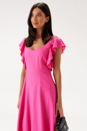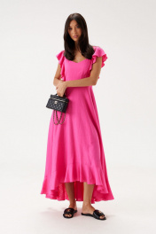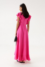 Платье полуприлегающего силуэта. Выполнено из льняного полотна розового цвета. С подкладкой. Вырез горловины фигурный. Линия талии отрезная. От отреза по линии плеча по переду и по спинке волан. По низу юбки волан. Застёжка - потайная молния в среднем шве заднего полотна. Длина спинки платья 134 см