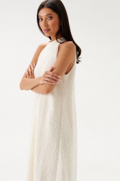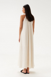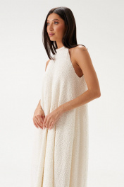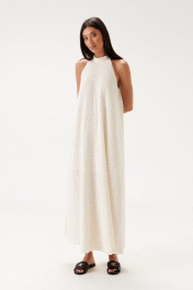 Платье прямого кроя, расширенное к низу. Выполнено из полотна «букле-венгерка» молочного цвета. С подкладкой. Горловина стойка, застегивающаяся по спинке на застежку-пуговички. Длина спинки 132 см