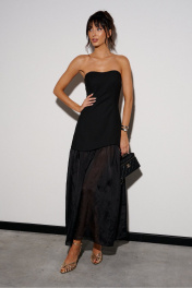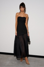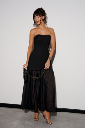 Платье выполнено из черной костюмной ткани и мягкой органзы. Характеристики: верх корсетного типа, на брендированной подкладке, юбочная часть выполнена из мягкой органзы, сзади по центру потайная молния. Длина изделия 122 см.
