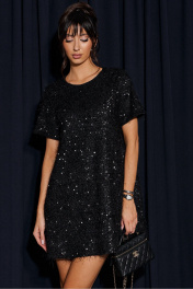 Платье свободного силуэта. Выполнено из фактурного ворсистого полотна с пайетками в черном цвете. Горловина овальная, рукав втачной, застежка на петлю пуговичку на спинке, рукав втачной, есть подкладка. Длина спинки 80 см, длина рукава 21 см