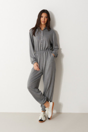 Комбинезон свободного кроя. Выполнен из трикотажа серого цвета. Без подкладки. Вырез горловины круглый. Воротник стойка. Застёжка центральная - пуговицы. Рукав втачной, спущенный, с манжетом на резинке. Пояс на резинке. Брюки с манжетом на резинке. В брючинах наклонные карманы. Длина спинки верха 38 см. Длина рукава (от линии втачивания) 60 см. Длина бокового шва брючины (с учётом пояса) 109 см