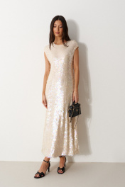 Платье прямого кроя выполнено из полотна с пайетками. Характеристики: на подкладке, без рукавов, вырез горловины круглый, горловина и проймы окантованы эластичной бейкой. Длина изделия 133 см.