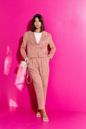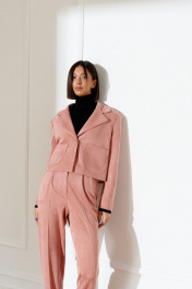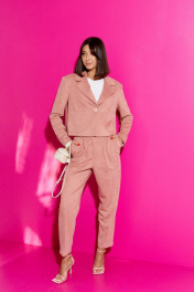 Комплект 2-х предметный состоящий из жакета и брюк. Жакет женский на подкладке с подплечниками укороченный. V образный вырез горловины, воротник с плавным срезом, остроугольные лацканы. Рукав втачной. Застежка центральная на петлю пуговицу. По переду изделия накладные карманы. Спинка цельнокроеная. Длина жакета 47, длина рукава 59. Брюки прямого кроя. Пояс брюк стабильный, по поясу нашиты шлевки. По переду декоративные складки. По переднему и заднему полотну брюк заутюженные стрелки. Карманы «хулиганы». Длина брюк 100 см.