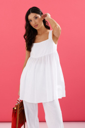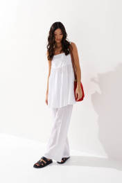 Комфортный комплект состоящий из туники и брюк выполнен из светлого легкого полотна.Характеристики: туника свободный крой, отрезная, широкие бретели. Длина от верхнего края бретели 81 см. Брюки свободного кроя, пояс брюк на резинке, в боковых швах карманы. Длина 113 см.