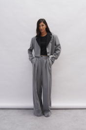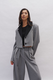 Укороченный жакет прямого кроя с акцентным воротником выполнен из костюмной ткани. Характеристики: укороченный, подплечники, крупный отложной воротник контрастного черного цвета, застежка центральная петли - пуговички, прорезной кармашек по передней части изделия, рукав втачной. Длина по спинке 43 см, длина рукава 62 см.
