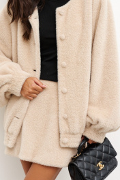 Кардиган силуэта бомбер, выполнен из фактурного полотна бежевого цвета. Характеристики: прямой крой, горловина круглая, отстроченая, , застежка центральная на петли пуговицы, широкий спущеный рукав, манжет-резинка, по низу изделия резинка. Длина по спинке 70 см, длина рукава от горловины 84 см.