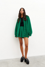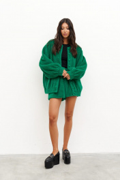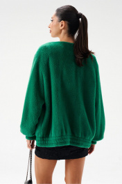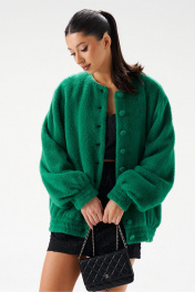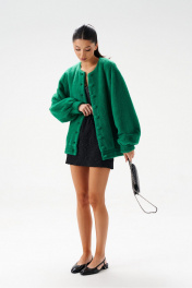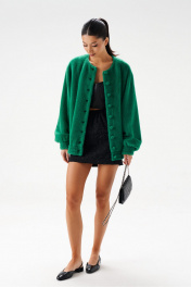 Кардиган силуэта бомбер, выполнен из фактурного полотна зелёного цвета. Характеристики: прямой крой, горловина круглая, отстроченая, , застежка центральная на петли пуговицы, широкий спущеный рукав, манжет-резинка, по низу изделия резинка. Длина по спинке 70 см, длина рукава от горловины 84 см.