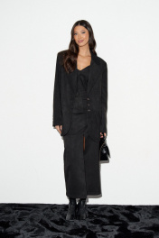 Жакет однобортный. Выполнен из эко-замши. Прямой крой, горизонтальный подрез ниже линии талии, подклад, разреза в спинке нет. Воротник с остроугольным лацканом. Застёжка контрастные петли-пуговицы. Карманы по переду внизу с клапаном без застёжки (функциональные), по груди карман-листочка (нефункциональный). Рукав втачной, на рукваве контрастные петли-пуговицы (нефункциональные), длина 65 см. Длина спинки 77 см