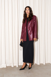 Жакет двубортный. Выполнен из эко-кожи бордового цвета. Полуприлегающий силуэт, подклад, отрезной бочок, приталиевые выточки по передней части, в среднем шве спинки разрез 18 см. Воротник с остроугольным лацканом. Застёжка петли-пуговицы (декорированы тканью основного изделия). Карманы по переду внизу с клапаном без застёжки (функциональные). Рукав втачной, на рукаве петли-пуговицы (нефункциональные, декорированы тканью основного изделия), длина 61 см. Длина спинки жакета 70 см.