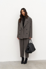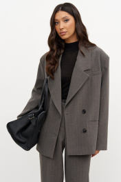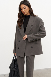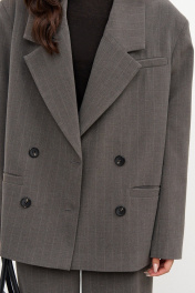 Жакет прямого кроя, выполнен из ткани серого цвета в тонкую полоску. Жакет двубортный, плечики, подклад, вортник с остроугольным лацканом, по преду изделия прорезные карманы (функциональные), застежка петли-пуговицы, рукав втачной, на рукаве декоративные пуговицы. Длина рукава от края горловины длина 81 см. Длина жакета по спинке от края горловины 72 см.
