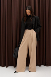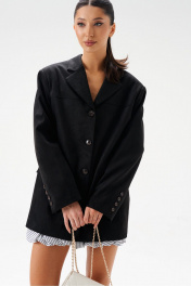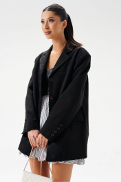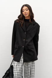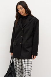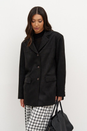 Жакет прямого свободного кроя. Выполнен из эко-замши. Есть подклад. По переду и по спинке кокетки. Воротник отложной с лацканами. Застёжка центральная петли-пуговицы. Рукав втачной, на рукаве петли-пуговицы (нефункциональные). Длина рукава 62 см. По переду внизу карманы с рамкой и с листочкой (функциональные). В среднем шве заднего полотна изделия шлица 24 см. Длина спинки 76 см