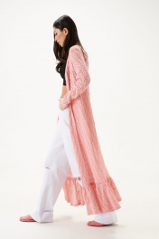 Кардиган. Выполнен их вязаного трикотажа. Свободный крой. Вырез горловины V-образный. Рукав втачной. Застёжка центральная пуговицы. По низу волан со сборкой. Длина рукава от линии втачивания 66 см. Длина спинки 132 см