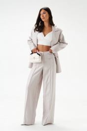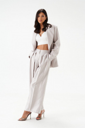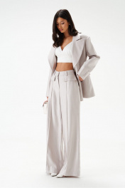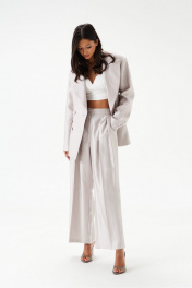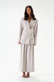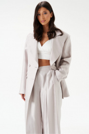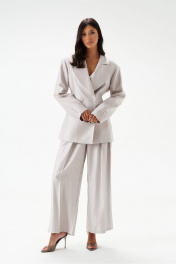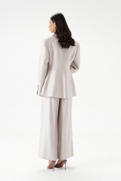 Жакет двубортный. Выполнен из полотна серо-перламутрового цвета с блеском. Полуприлегающий силуэт, подклад, отрезной бочок, приталиевые выточки по передней части. Воротник с остроугольным лацканом. Застёжка петли-пуговицы (декорированы тканью основного изделия). Карманы по переду внизу с клапаном без застёжки (функциональные). Рукав втачной, на рукаве петли-пуговицы (нефункциональные, декорированы тканью основного изделия), длина рукава от края горловины 80 см. Длина спинки жакета 72 см.