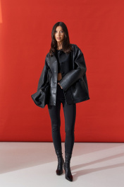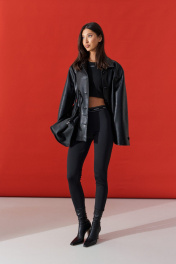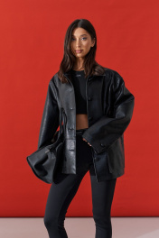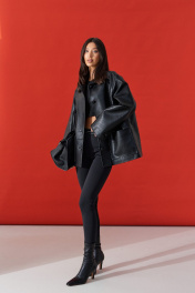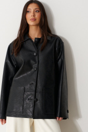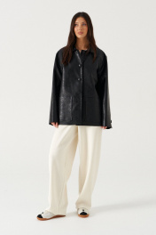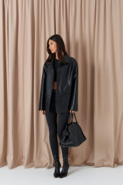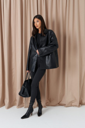 Куртка прямого свободного кроя. выполнен из фактурной эко-кожи чёрного цвета. С подкладкой. Воротник отложной. Рукав втачной, немного спущен. По переду накладные карманы. По окружности жакета подрез ниже линии талии. Спинка отрезная. Застёжка центральная пуговицы. Длина спинки 70 см. Длина рукава от линии втачивания 60 см