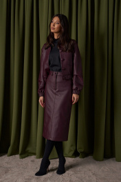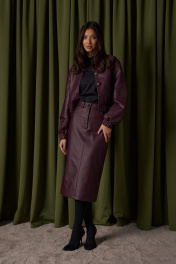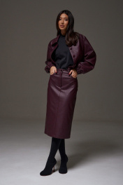 Укороченный жакет. Выполнен из фактурной эко-кожи бордового цвета. С подкладкой. Воротник отложной. Рукав втачной, немного спущен, с мантежой на резинке. Низ изделия с резинкой. По переду прорезные карманы. Застёжка центральная пуговицы. Длина спинки 49 см. Длина рукава от линии втачивания 61 см*жакет дополнит юбка а1611