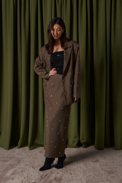 Жакет прямого свободного кроя выполнен из костюмной ткани цвета хаки с декоративной вышивкой.Характеристики: прямой свободный крой,брендированная подкладка, подплечники, воротник с остроугольным лацканом, застежка центральная на петлю - пуговицу, по переду функциональные карманы с клапаном, рукав втачной, спинка со средним швом, в среднем шве разрез 23 см. Длина по спинке 76, длина рукава 63 см.