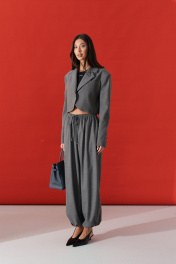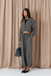 Жакет прямого кроя. Выполнен из ткани выполнен из костюмной ткани серого цвета. Характеристики: укороченный, брендированная подкладка, подплечники, отложной воротник с остроугольным лацканом, застежка центральная - петля пуговица, низ изделия с плавным срезом, рукав втачной по низу рукава нашиты пуговички. Длина по спинке от края горловины 44см, длина рукава от края горловины 78 см.