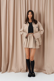 Жакет свободного кроя, выполнен из полотна бежевого цвета. Характеристики: воротник отложной, застёжка центральная на петли пуговицы, брендированный подклад (стеганный и утепленный), по переду изделия прорези с карманами, на груди брендированная нашивка, отрезная спинка, вточной широкий рукав, спущен, заканчивается широким манжетом,по низу изделия резинка. Длина по спинке от края горловины 70 см, длина рукава от края горловины 81см.
