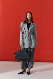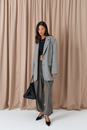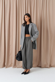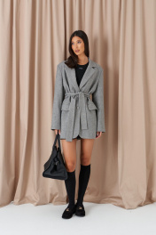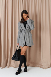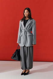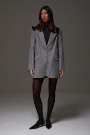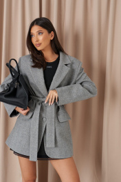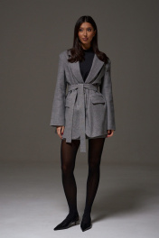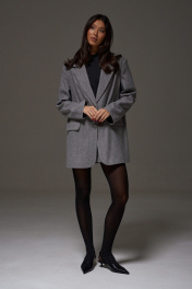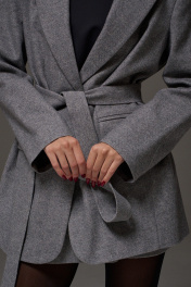 Жакет прямого свободного кроя. Выполнен из шерстяной (смесовой) ткани серого цвета. Характеристика: подкладка, воротник отложной с лацканами, рукав втачной и чуть спущен, по переду карманы с клапанами, застёжка центральная - пуговицы, в среднем шве заднего полотна шлица (29,5 см). В комплекте пояс из ткани основного изделия. Длина спинки 78 см. Длина рукава от линии втачивания 62 см