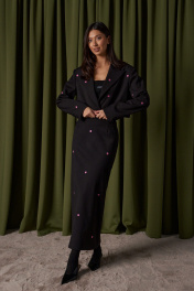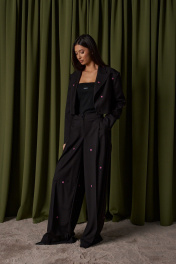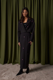 Жакет выполнен из костюмной ткани черного цвета с цветочной вышивкой. Характеристика: укороченный жакет, отложной воротник с острым лацканам, центральная застежка на петлю-пуговицу, брендированный подклад, рукав втачной, чуть спущенный, подплечники, на манжете три пуговицы. Длина рукава от края горловины 79см, длина жакета по спинке 43см.