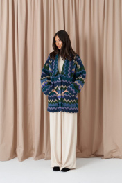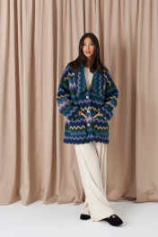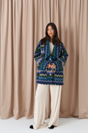 Кардиган прямого свободного кроя, выполнен из полотна трикотажа крупной вязки. Характеристика: жакет прямого кроя, отложной воротник, центральная застежка на петли-пуговицы, по переду изделия два накладных кармана,брендированная подкладка, рукав свободный, линия плеча спущена, спинка цельнокройная. Длина рукава от края горловины 76см, длина изделия по спинке о края горловины 81см.