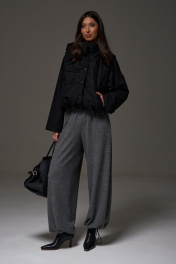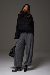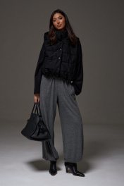 Жилетка укороченный, выполнен из стеганной трикотажной ткани черного цвета. Характеристика: жилет А-силуэта, вортник стойка, капюшон цельный с жилетом, центральная застежка на молнию, скрывается под планкой на кнопках, боковые карманы на молнии, по низу изделия резинка с фиксаторами, брендированный подклад, спинка цельнокройная. Длина изделия от края горловины по спинке 58см.