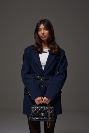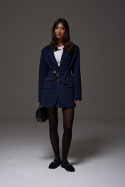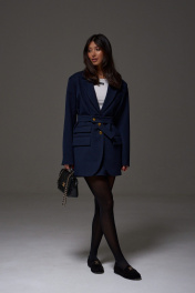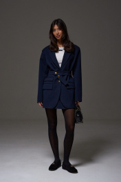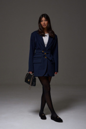 Жакет прямого свободного кроя выполнен из текстильного полотна темно-синего цвета.Характеристики: прямой свободный крой, подплечники, брендированная подкладка, отложной воротник с лацканом, застежка центральная на петли пуговицы, по переду прорезной кармашек «обманка», функциональные карманы с клапаном, рукав втачной прямого кроя, по низу рукава нашиты пуговички. низ изделия с плавным срезом, в комплекте пояс из ткани основного изделия, длина пояса 100см. Длина по спинке 81 см, длина рукава от края горловины 78.5 см.