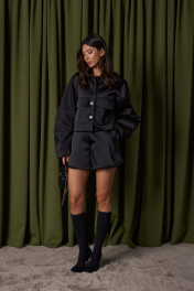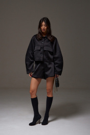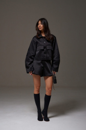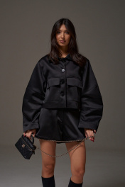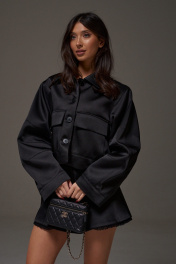 Жакет прямого свободного кроя. Выполнен из плотного текстильного полотна с лёгким блеском. С подкладкой. Воротник отложной из фактурной эко-кожи. Рукав втачной, объёмный, с выточками, с узкой манжетой. Застёжка центральная - пуговицы. По переду внизу накладные карманы с клапаном. Спинка с отрезной кокеткой. Длина рукава от линии втачивания 64 см. Длина спинки 48,5 см