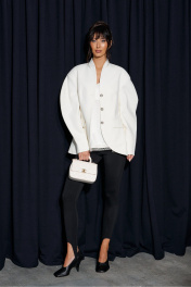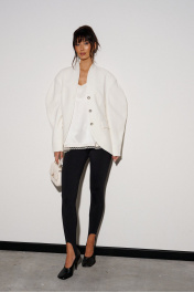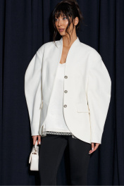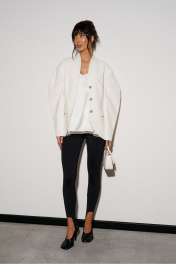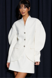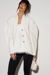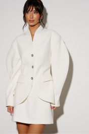 Жакет прилегающего силуэта. Выполнен из костюмный ткани белого цвета. С подкладкой. Воротник-стойка. Вырез горловины V-образный. Рукав втачной, объёмный, заужен к низу. По переду карманы с клапаном. Застёжка центральная - пуговицы. Низ жакета фигурный. Длина спинки 69 см. Длина рукава от линии втачивания 63 см