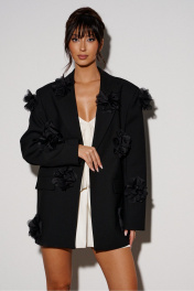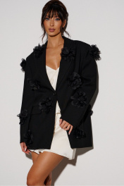 Жакет прямого свободного кроя выполнен из костюмной ткани черного цвета, декорирован несъемными цветами из шифона . Характеристики: прямой свободный крой, брендированная подкладка, подплечники, воротник с остроугольным лацканом, застежка центральная на петлю - пуговицу, по переду функциональные карманы с клапаном, рукав втачной, по низу рукава нашиты пуговички, спинка со средним швом, в среднем шве разрез 24 см. Длина по спинке 76, длина рукава 63 см.