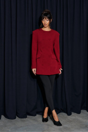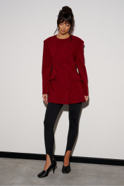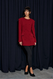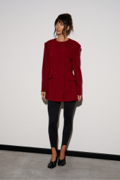 Жакет полуприталенного силуэта выполнен из костюмной ткани бордового цвета. Характеристики: полуприталенный силуэт, двубортный, брендированная подкладка, подплечники, овальный вырез горловины, по переду функциональные карманы с клапаном, рукав втачной, по низу рукава нашиты пуговички. Длина по спинке 77, длина рукава от края горловины 75 см.