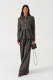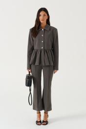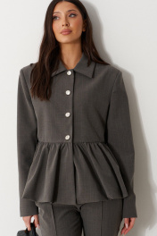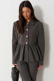 Жакет прямого кроя серого цвета с полоской, с баской по нижней части изделия. Выполнен из костюмной ткани. Характеристики: на подкладке, отложной воротник, застежка центральная на пуговички, рукав втачной. Длина по спинке от края горловины 62 см, длина рукава 77 см.