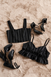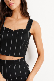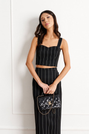Топ на широких бретелях выполнен из черной ткани с вертикальными белыми полосками. Характеристики: укороченный, фигурный вырез горловины, широкие бретели, по переду изделия вытачки, по спинке резинка со сборкой, застежки в изделии нет. Длина изделия от верхнего края бретели 36 см