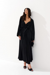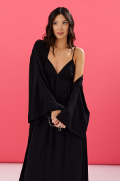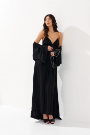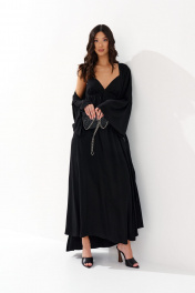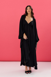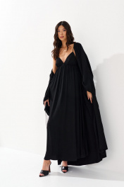 Туника прямого свободного кроя выполнена из струящегося полотна черного цвета. Характеристики: прямой крой, по линии талии нашиты шлевки, в комплекте пояс из ткани основного изделия, рукав широкий цельнокроеный, в боковых швах разрезы (70 см). Длина по спинке 135 см, длина рукава 75 см от края горловины.