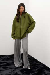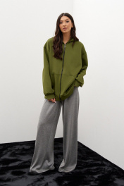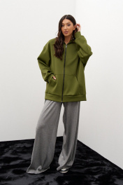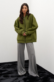 Толстовка с капюшоном. Выполнена из трикотажного полотна зелёного, травянистого цвета. Свободный крой, изделие удлиненное, без подклада. Застёжка: центральная молния. Карманы: накладные функциональные. Рукав: втачной, спущенный, длина от горловины 81 см см. Длина спинки 70 см.