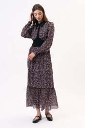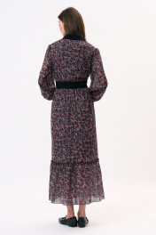 Плать полуприлегающего силуэта из шифона с дизайнерским принтом. Воротник рубашечного типа, застежка центральная на петли и пуговицы, в боковом шве обработана потайная молния. Рукав длинный, втачной с манжетой. Платье отрезное по линии талии. Длина спинки 128, 128, 128, 128 Ширина изд на уровне проймы 49, 51, 53, 55 Длина рукава 63, 63, 63, 63 Ширина изд по линии талии 42, 44, 46, 48 Ширина изд на уровне линии бедер 73, 75, 77, 79