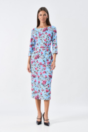 Платье полуприлегающего силуэта изготовлено из трикотажного полотна. На переде и спинке обработаны вытачки, платье отрезное по линии талии, рукав втачной, короткий. Горловина по переду овальной формы, по спинке V-образной. Застежка на спинке на потайную Длина спинки 105, 105, 105, 105, 105 Ширина изд на уровне проймы 44, 46, 48, 50, 52 Длина рукава 44, 44, 44, 44, 44 Ширина изд по линии талии 37, 39, 41, 43, 45 Ширина изд на уровне линии бедер 48, 50, 52, 54, 56 Ширина рукава на уровне глуб проймы 16.1, 16.8, 17.5, 18.2, 18.9