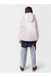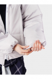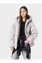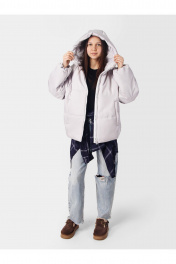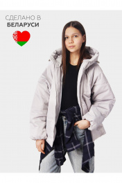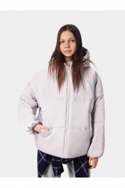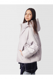 Куртка для девочки подростковой группы, утепленная. На переде по борту и переднему краю воротника-стойки разъемная застежка-молния и настрочная планка, застегивающаяся на пять потайных кнопок. По переду проложены строчки-стежки. На переде обработаны прорезные карманы с застежкой-молнией. Рукава втачные, одношовные. Низ рукава стягивается эластичной лентой. На левый рукав настрочен шеврон. Капюшон двухшовный, втачной, с уступами, которые застегиваются на контактную ленту «велкро». Лицевой вырез капюшона стягивается шнуром, который продевается через блочки и фиксируется фиксаторами. Низ изделия обтачной, фигурной формы, стянут эластичной лентой.