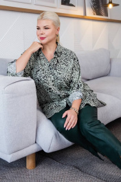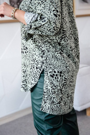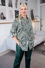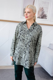 Длина изделия: 83 см Описание: туника прямого силуэта с длинным рукавом с притачной манжетой по низу. Горловина округлая с рубашечным воротником с отрезной стойкой. Застежка центральная на петли и пуговицы. По боковым швам по низу туники разрезы. На левой половине переда накладной карман.