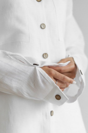Костюм выполнен из 100% умягченного льна, который прошел специальную энзимную обработку, поэтому изделие не колется и не дает усадки. Состоит из брюк и рубашки. Брюки палаццо, расширенные к низу с высокой посадкой, застежка на молнию и пуговицу. По талии для удобства сделана частично резинка. Рубашка свободная, прямая,со спущенным плечом и длинным рукавом с манжетой. Застежка центральная на петли и пуговицы. Воротник рубашечный,по переду карманы. По спинке сделана глубокая шлица на пуговицах.