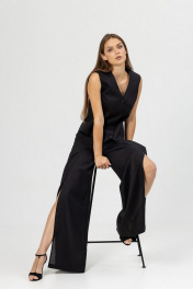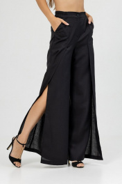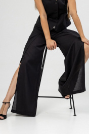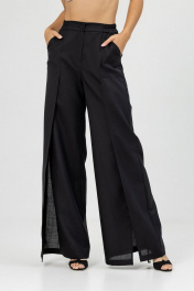 Брюки палаццо, высокой посадки, пояс частично на резинке.Застежка на молнию и петлю с пуговицей, в боковых швах карманы. По передним половинкам брюк выполнена складка и высокий разрез.