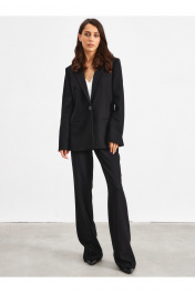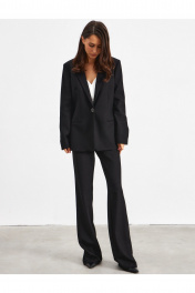 Комплект из жакета и брюк, выполнен из костюмно-плательной ткани в черном цвете. Жакет полуприлегающего силуэта выполнен из фактурной ткани черного цвета. Характеристики: полуприлегающий силуэт, подкладка, застежка центральная на стильную пуговицу, по переду прорезные карманы. Брюки на средней посадке, прямые, расширенные к низу изделия, на стабильном поясе, с боковыми карманами, по переду застежка на скрытую молнию и пуговицу.