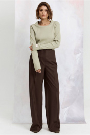 Брюки прямого свободного кроя выполнены из костюмной ткани. Пояс стабильный. Брюки приталенные, расширенные к низу. По передней части прошитые швы. Длина брюк 114