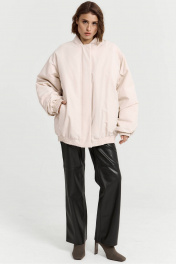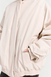 Бомбер в светлом цвете. Выполнен в стиле оверсайз и отлично подойдет для создания актуальных трендовых образов. Бомбер имеет два кармана, воротник-стойку и застежку на кнопках. Рукава бомбера с манжетами на резинке в цвет всего бомбера. Отличный вариант верхнего слоя на раннюю весну.