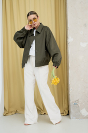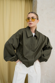 Весенняя куртка в цвете хаки. Дизайн сочетает в себе элементы оверсайза и минимализма. Куртка свободного кроя, по низу на резинке. Имеет два накладных кармана, воротник-стойку и застежку на молнию и кнопки металлик. Куртка подходит для ранней весны и отлично впишется в любой гардероб.