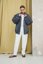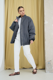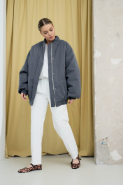 Бомбер в сером цвете. Выполнен в стиле оверсайз и отлично подойдет для создания актуальных трендовых образов. Бомбер имеет два кармана, воротник-стойку и застежку на кнопках. Рукава бомбера с манжетами на резинке в цвет всего бомбера. Отличный вариант верхнего слоя на раннюю весну.